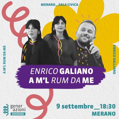 A Merano Enrico Galiano, insegnante di periferia, scrittore di bestseller tra i quali “L’arte di sbagliare alla grande”, “Scuola di felicità per eterni ripetenti, creatore della webserie “Cose da prof”, nominato nel 2020 tra i 10 prof più influenti d’Italia dal Sole 24 ore, incontra il collettivo femminile artistico A M’l Rum da me, specializzato in progetti artistici come mezzo per trattare temi sociali e per valorizzare il territorio.